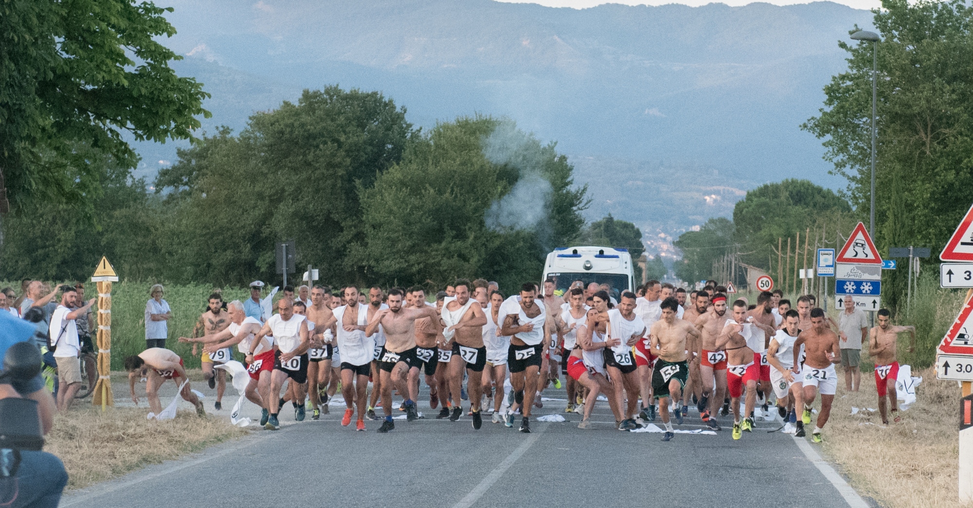 Il s’agit de l’un des plus anciens Palio d’Italie et d’un défi entre municipalités, avec une course à pied qui part symboliquement de la Cappella della Vittoria (chapelle de la Victoire), lieu de la bataille, et se termine sur la Piazza Baldaccio, après une ascension de 1400 mètres.