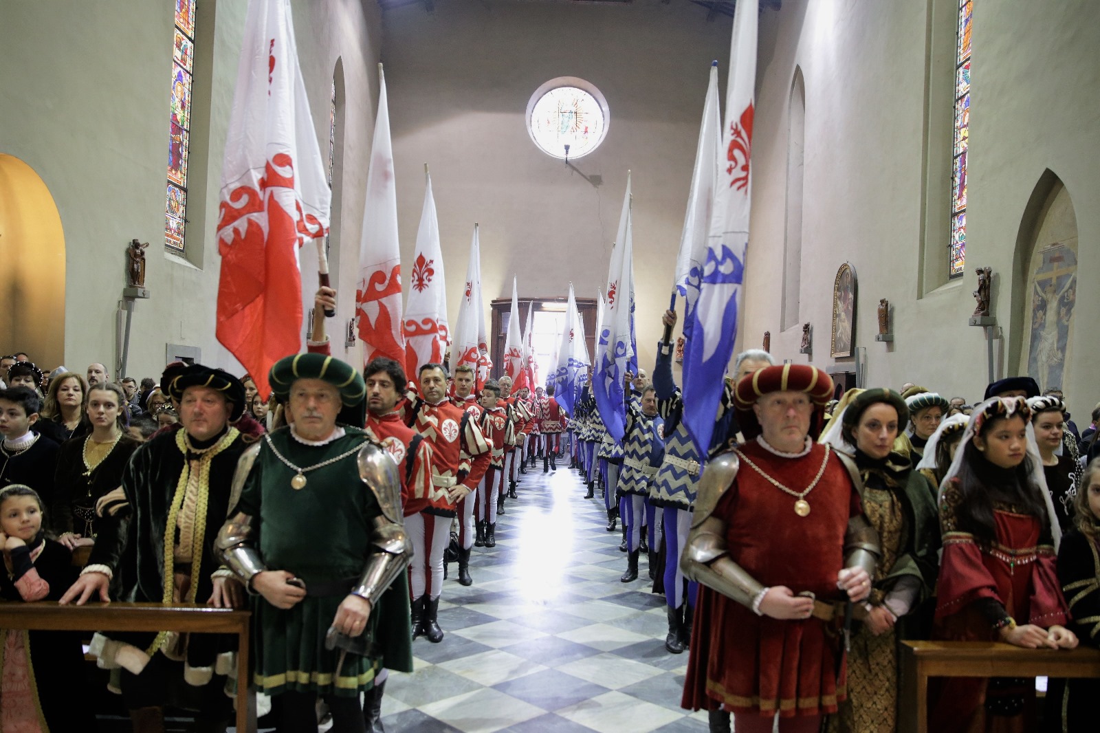 Une procession historique traverse les rues du centre, menée par les Sbandieratori (agitateurs de drapeaux) et, depuis quelques années, également par les figurants des 4 portes de la ville en costume historique et les personnalités institutionnelles de la ville.