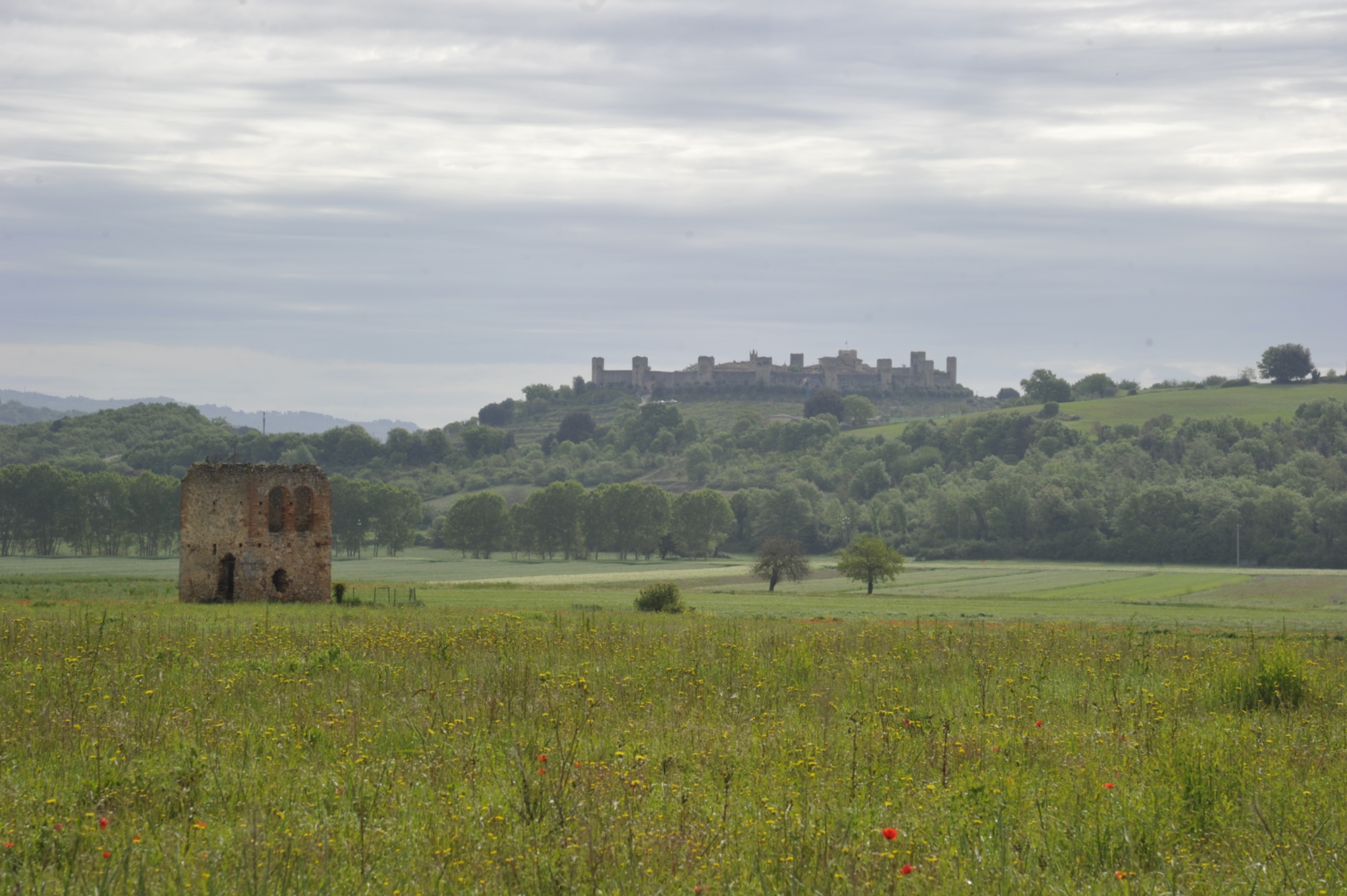 Peu après San Vivaldo, nous atteignons le point le plus élevé de l’itinéraire, à 540 m. À partir de là, la descente commence, entrecoupée de quelques petites montées, dont une qui mène à San Gimignano, un village qui n’a plus besoin d’être présenté et qui vaut certainement la peine de s’y arrêter. Nous poursuivons notre descente jusqu’au fond de la vallée du torrent Foci, où commence la dernière montée de la journée, qui nous fera franchir un dénivelé de 140 mètres juste avant Colle Val d’Elsa, un autre village dont le centre historique vaut certainement la peine d’être visité. Sur cet itinéraire, nous préférons contourner le village par un chemin de terre de quelques kilomètres pour éviter les voitures. Le dernier tronçon est en montée et en descente continues et nous montre de loin la silhouette emblématique de Monteriggioni, où se termine notre aventure.