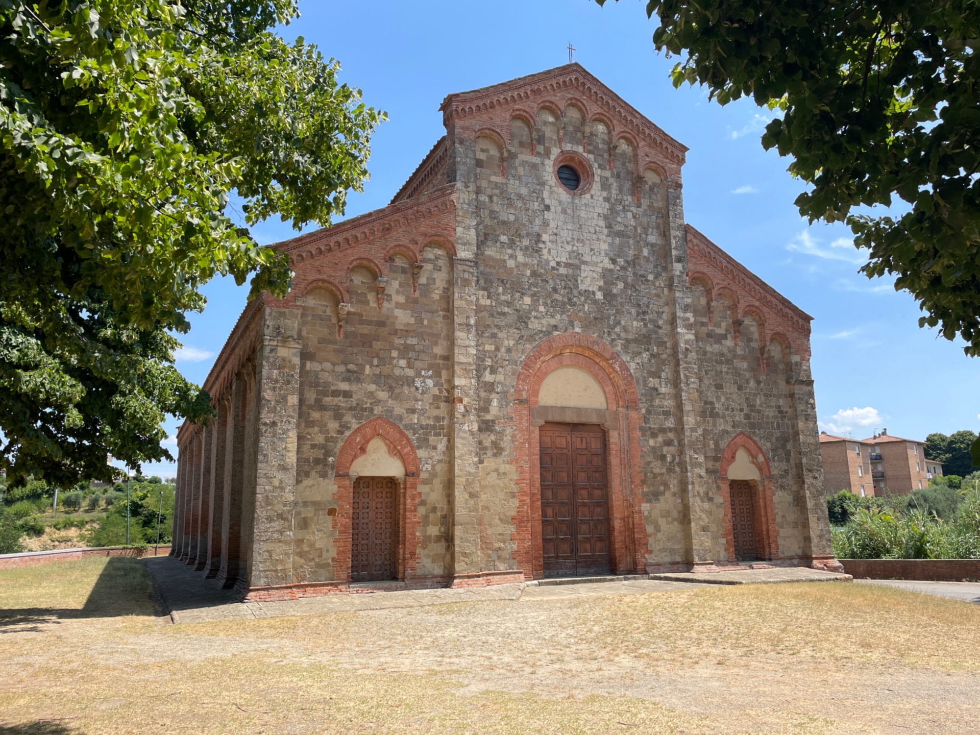 Sur les 20 kilomètres suivants, nous abordons cinq montées, avec des dénivelés compris entre 60 et 90 mètres et quelques montées difficiles, notamment celle qui précède Lari, un petit village perché autour de son château qui mérite certainement une petite visite et peut-être une halte rafraîchissante sur la place du village. Au kilomètre 52 environ, nous traversons le village de Villa Saletta, où le grand manoir, les habitations paysannes, les églises et les places offrent un bel exemple de domaine historique toscan. Au 58e kilomètre, le village de Palaia, qui a conservé une partie de son caractère médiéval, mérite le détour. Depuis les vestiges de la forteresse, la vue est à couper le souffle, tandis qu’à l’extérieur du village se dresse l’imposante église romane de San Martino, avec sa façade en pierre et le reste entièrement en terre cuite. Une fois l’exploration terminée, nous reprenons la route et, après avoir passé Montefoscoli, nous descendons abruptement vers le fond de la vallée.