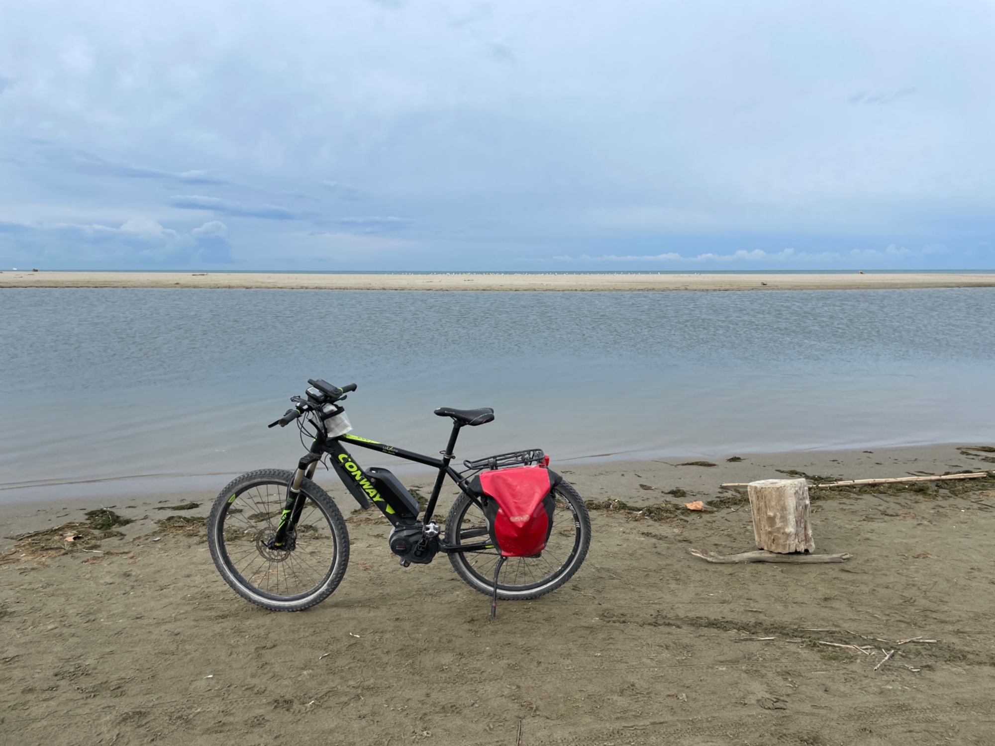 Au niveau de la route goudronnée, nous prenons la piste cyclable à droite en direction de Marina di Torre del Lago. Avant d'atteindre la mer, nous tournons à gauche sur un chemin de terre qui longe la mer sur quelques kilomètres jusqu'à Marina di Vecchiano. Nous parcourons un court tronçon sur l'asphalte et prenons ensuite le chemin qui continue parallèlement à la mer à travers le maquis méditerranéen jusqu'à l'embouchure du Serchio. Ici, nous devons pousser le vélo sur quelques centaines de mètres sur le sable, mais cela en vaut la peine car c'est un endroit magnifique.
