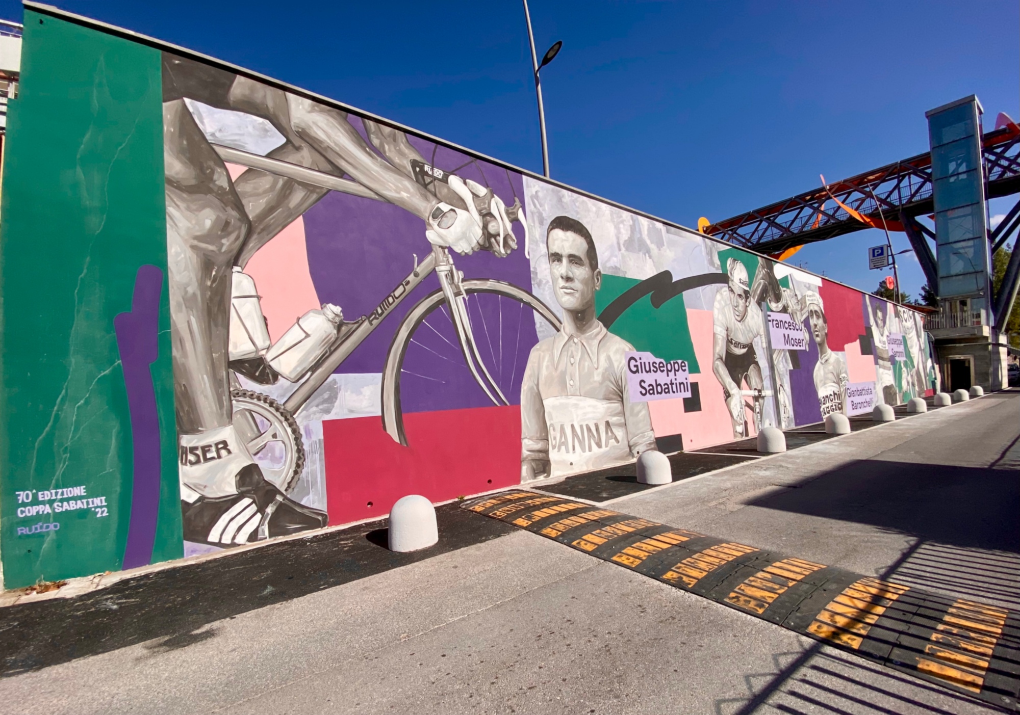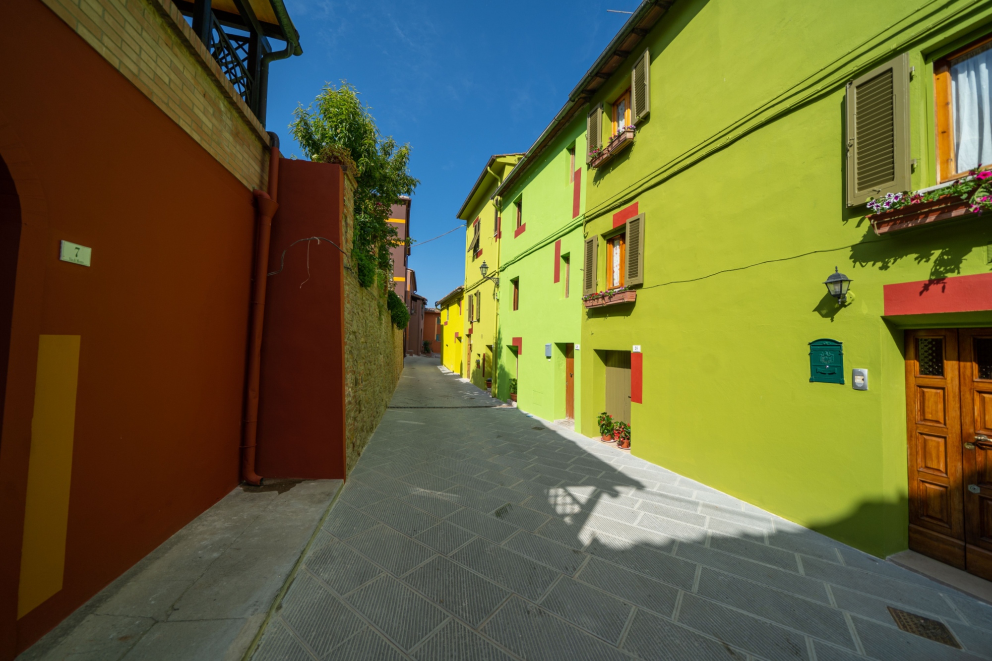 La route redevient non goudronnée jusqu'à ce qu'elle rejoigne la Via Poggetta, où nous tournons à droite pour rejoindre Ghizzano, le village coloré par l'artiste David Tremlett et qui abrite d'autres œuvres d'art en plein air. Après Ghizzano, nous reprenons une route de terre sur une dizaine de kilomètres jusqu'au hameau de Cedri. Nous continuons pendant quelques kilomètres sur des routes sûres avec très peu de circulation, immergés dans la belle campagne toscane. Au point où une rangée de cyprès borde la route, nous tournons à droite sur un autre tronçon de chemin de terre, qui nous mènera à Fabbrica et continuera sur l'asphalte jusqu'à Montecchio. La route redevient non goudronnée pour la dernière descente et montée qui nous ramène à Peccioli, notre point de départ.