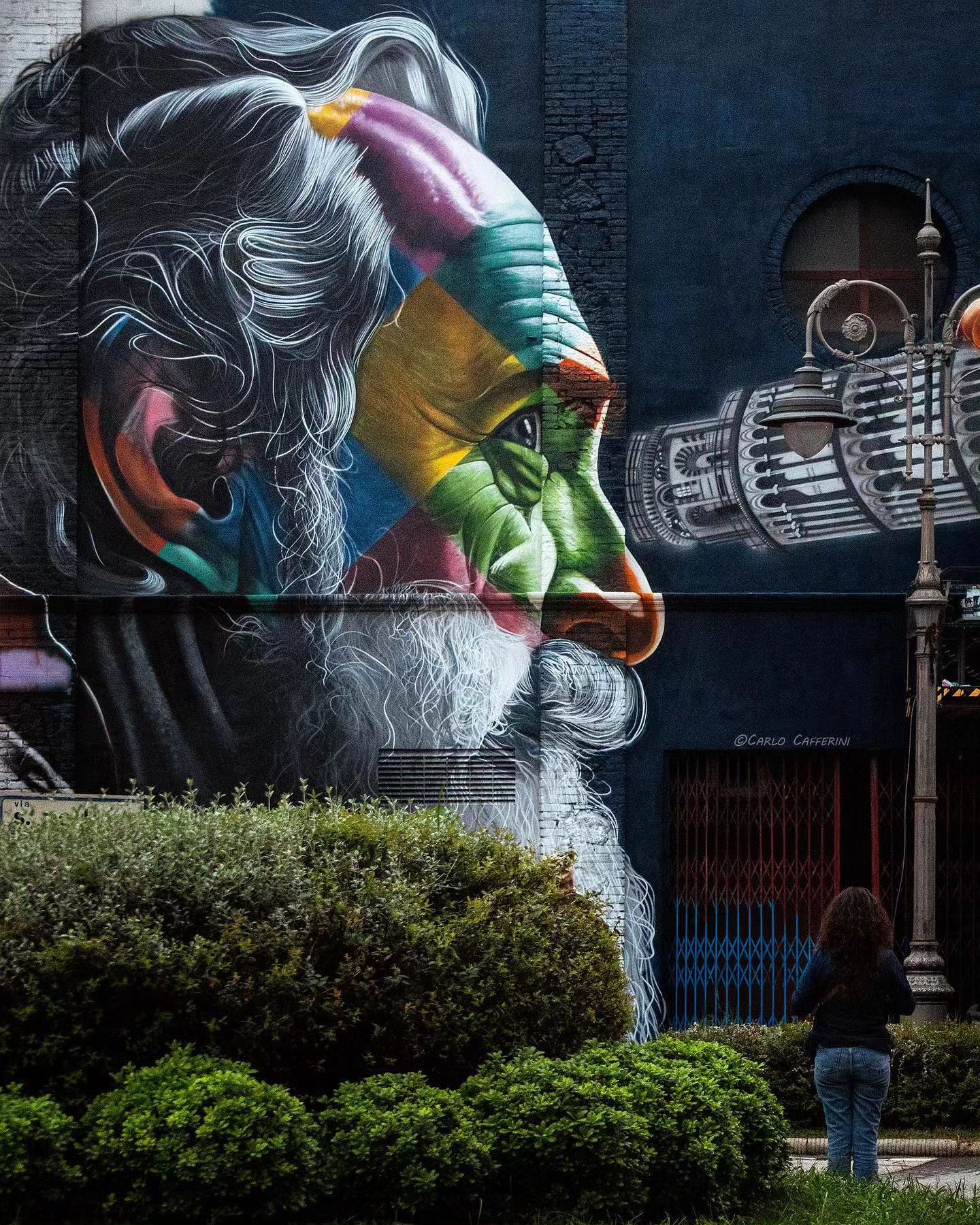 Enfin, nous traverserons l’Arno par le pont Solferino pour atteindre le plus récent hommage de la ville à Galilée. Depuis novembre 2023, sur le Macarone Center, on peut admirer l’imposant tag de 160 mètres de long du célèbre artiste de rue brésilien Kobra, représentant Galilée utilisant la tour penchée de Pise comme télescope, symbole de la science, de l’exploration et de la connexion entre l’ancien et le nouveau monde.