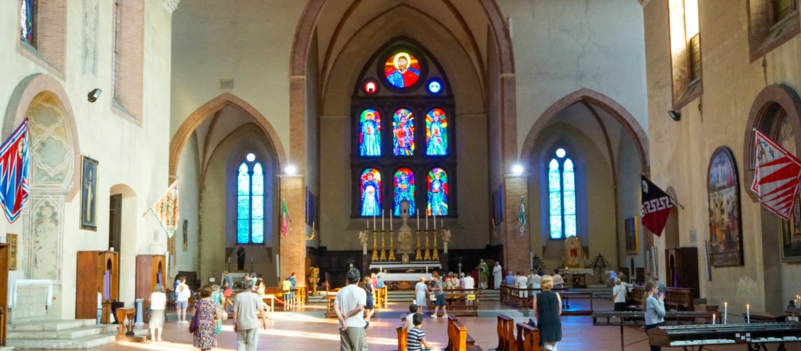 The head of Saint Catherine is certainly the most important relic of the saint, preserved in the chapel dedicated to her, located in the basilicia of San Domenico in Siena. It was detached from the body of the Sienese nun in 1381 at the request of Pope Urbano VI. For four years the head remained preserved inside, in a cupboard of the sacristy of San Domenico, but once that Assembly of the Republic found out about this, it gave the order to attribute pubic honours to the precious relic. On May 5 1385 there was an impressive procession which carried the relic to San Domenico, departing from the church of the Hospital of San Lazzara, outside Porta Romana. A group of nuns from San Domenica and Lapa, Catherine’s mother. Another important relic is the finger, also preserved in the Basilica of San Domencio: with this relic, benediction is granted to Italy and the Armed Forces in the afternoon of the Sunday when the International Festivals in honour of Saint Catherine of Siena take place. This relic, together with the rope with which the Sienese nun often disciplined herself and the bronze bust which for many years had contained and protected the head, is preserved in an artistically designed shrine, the work of the Sienese Architect Sandro Bagnoli, positioned in the right wall of the Basilica di San Domenico.